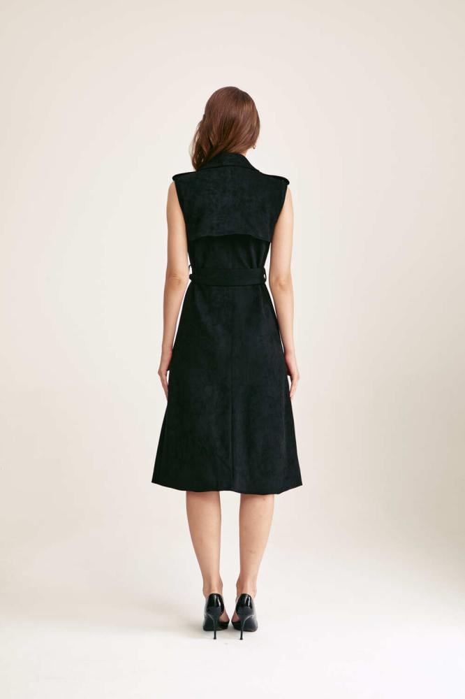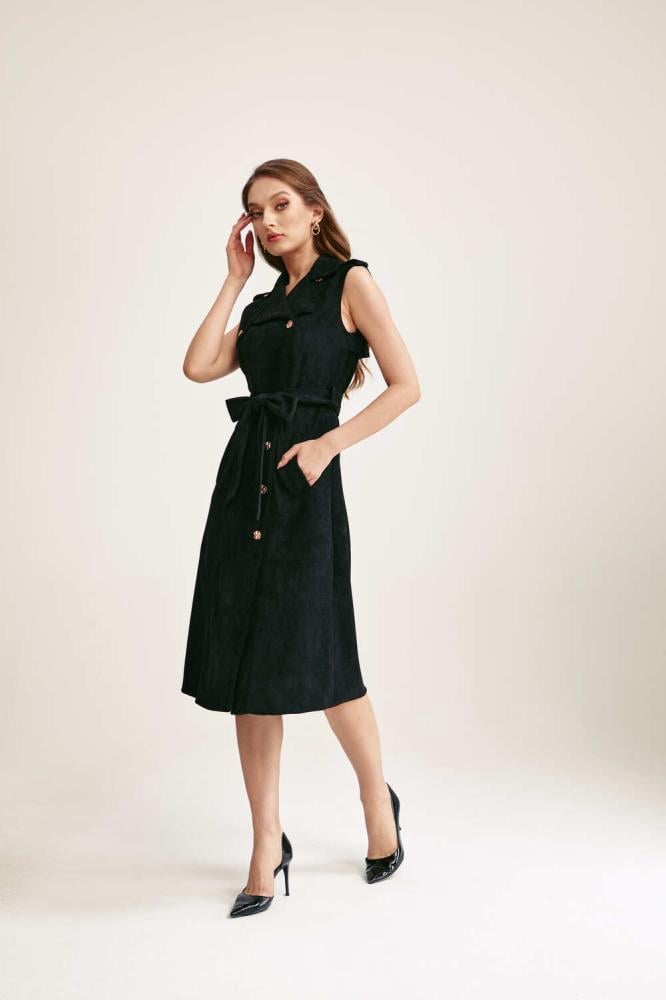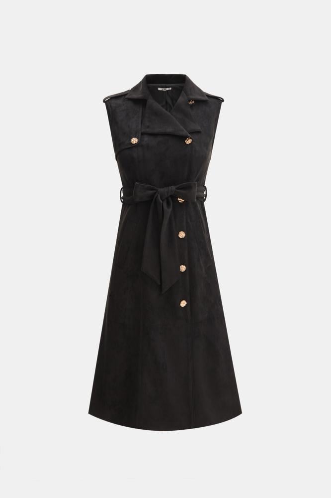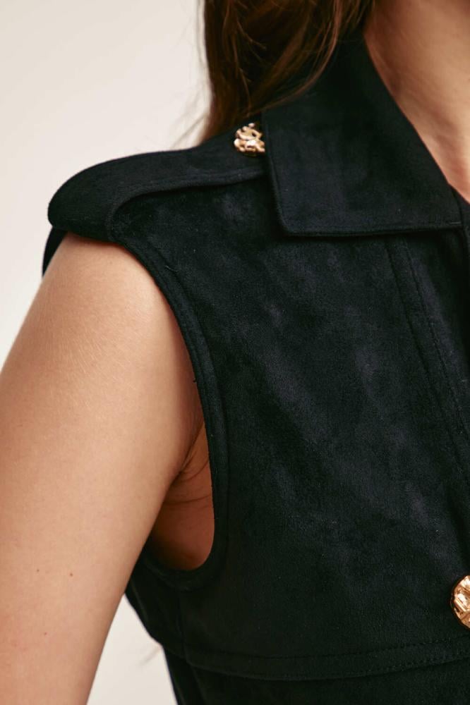 A suede dress embellished with elegant gold buttons, with a folded collar, sleeveless, and a tie belt that defines the waist and highlights the beauty of the cut.