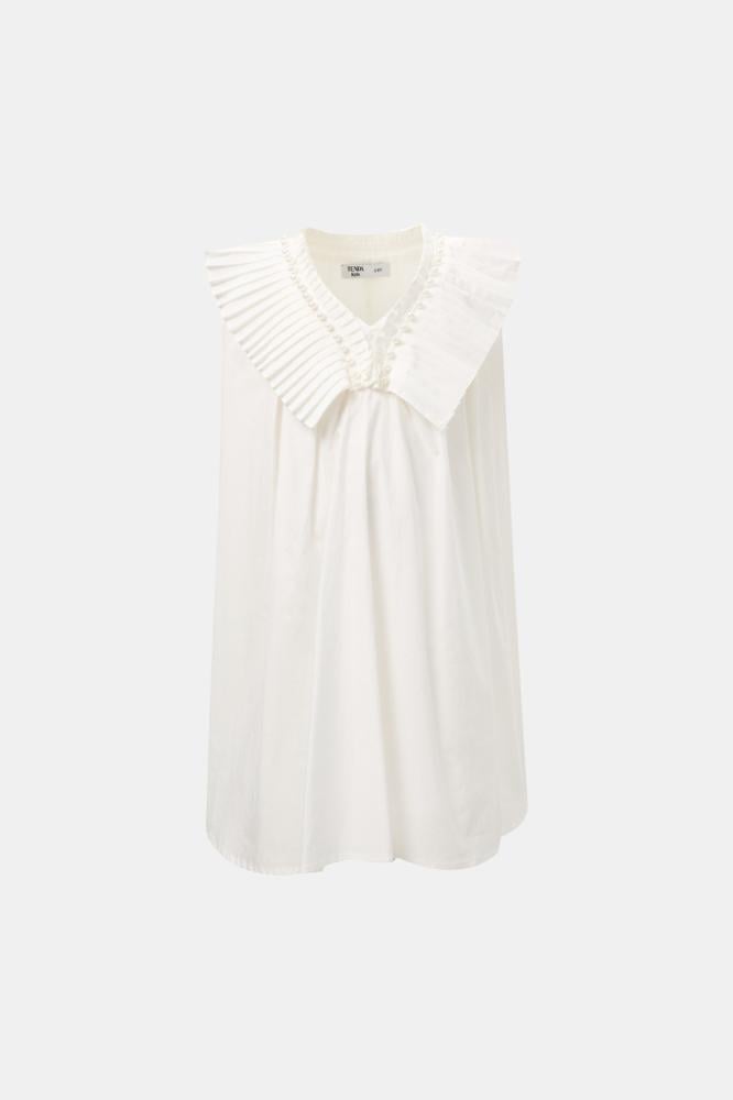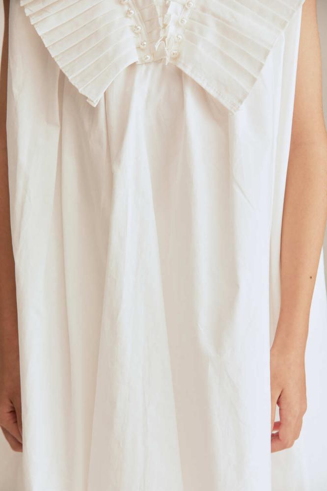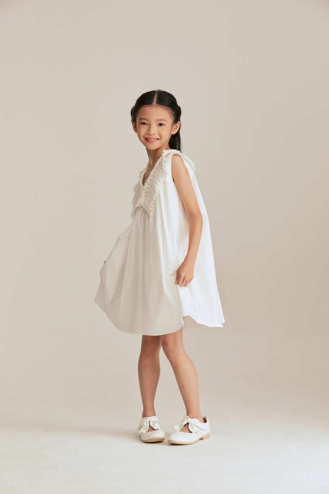 Give your daughter a delicate and elegant look with this modern dress, featuring a wide design with a collar decorated with pleats and pearl details.