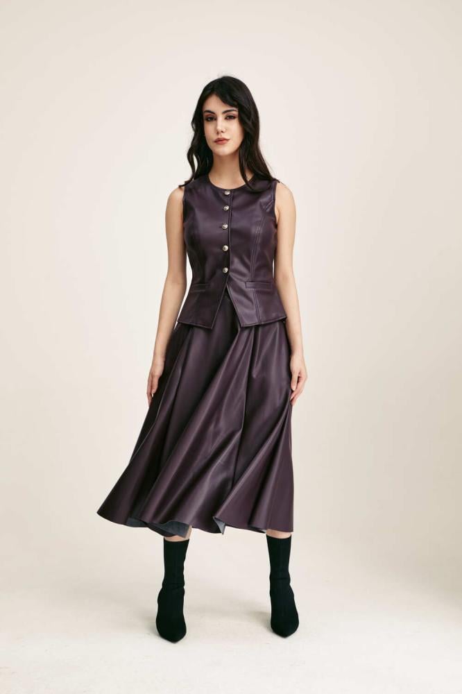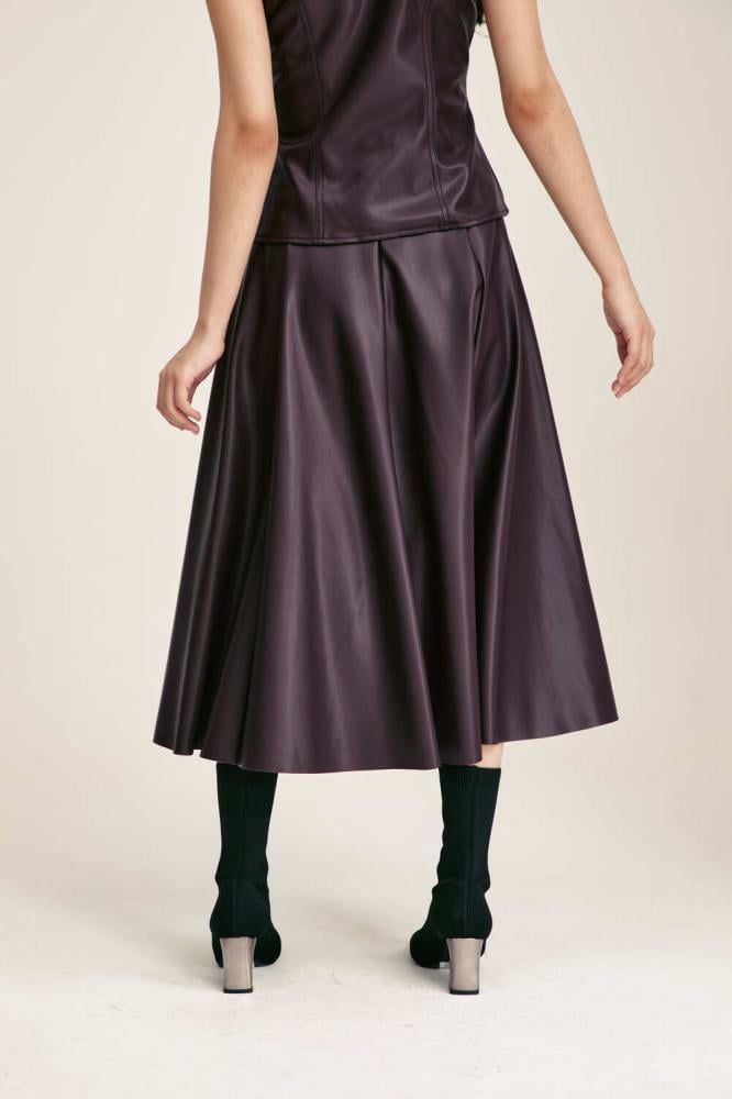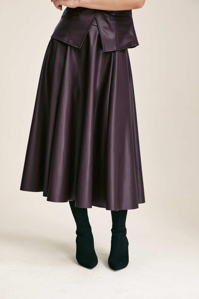 This skirt will add a diverse and distinctive touch to your look. It is made of leather, has a medium length cut, features a cloche cut, and has a hidden zipper closure.