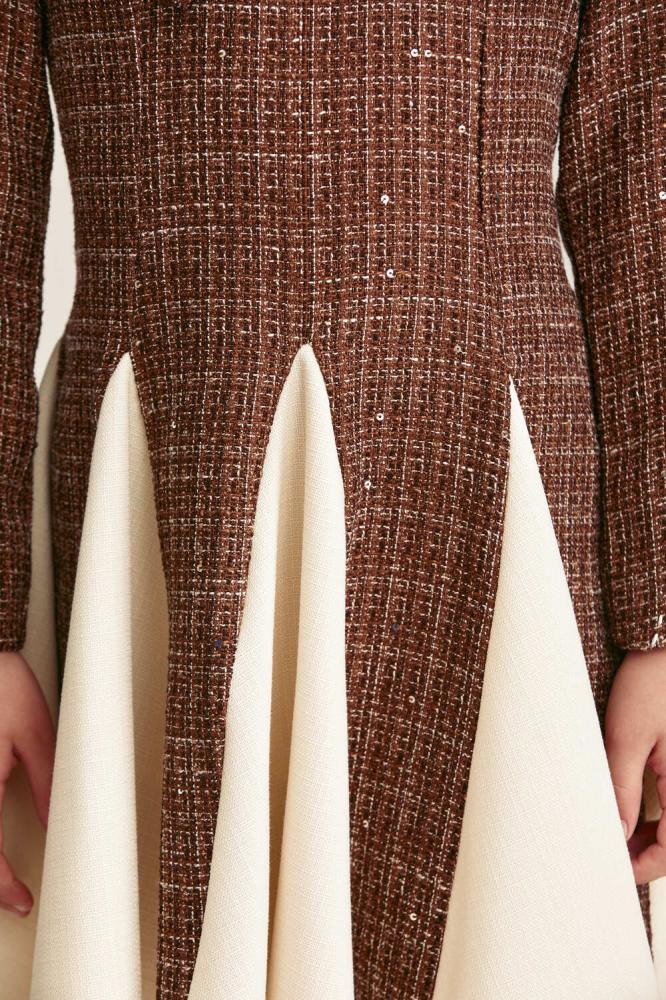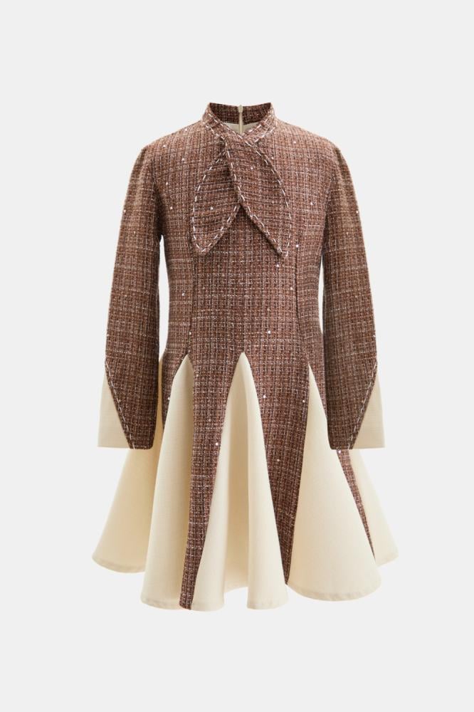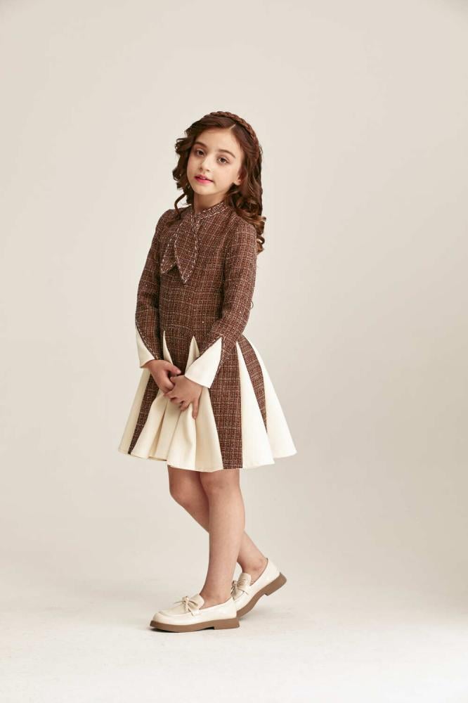 This off-white pleated dress adds a touch of movement and fun. With shimmering sequin details, a delicate tie-neck, and long sleeves, it makes your little one look even more radiant and beautiful. A great choice for a warm and cheerful look for special occasions.